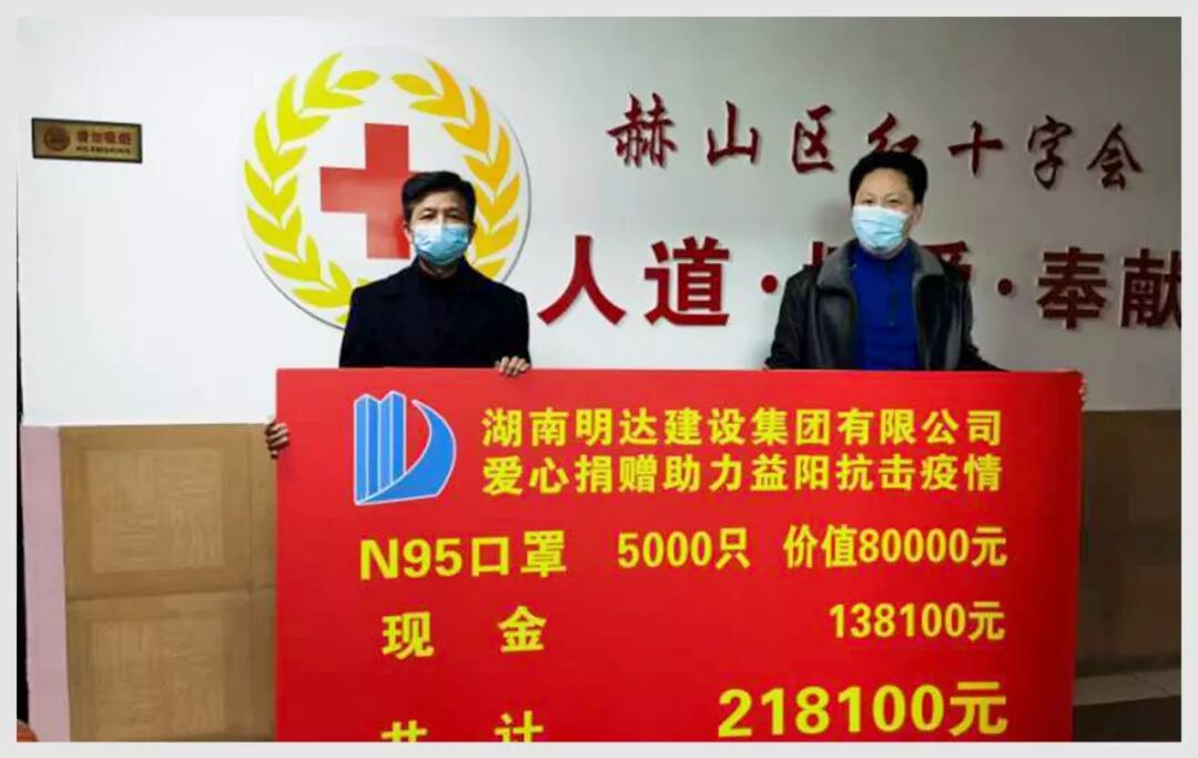 市人大代表、市人大常委会委员、湖南明达建设集团有限公司董事长、民建益阳市委副主委曹明光,爱心捐赠助力益阳抗击疫情,截至目前,共捐赠从印度购置医用级N95口罩5000只,现金138100元,共计218100元。