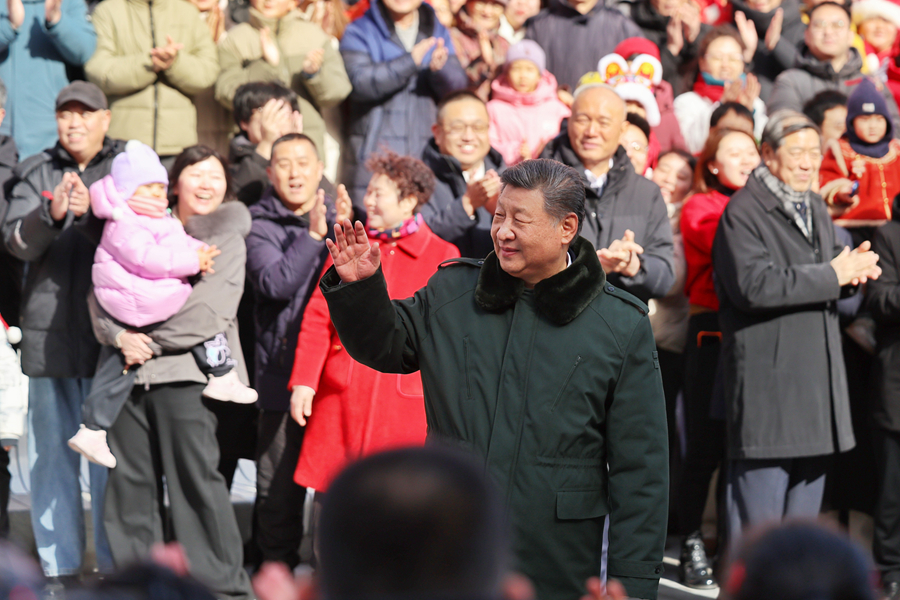 2月9日至10日,中共中央总书记、国家主席、中央军委主席习近平在北京考察并看望慰问基层干部群众。这是10日上午,习近平在东城区隆福寺街区考察时,向现场群众挥手致意。新华社发(肖翊 摄)
